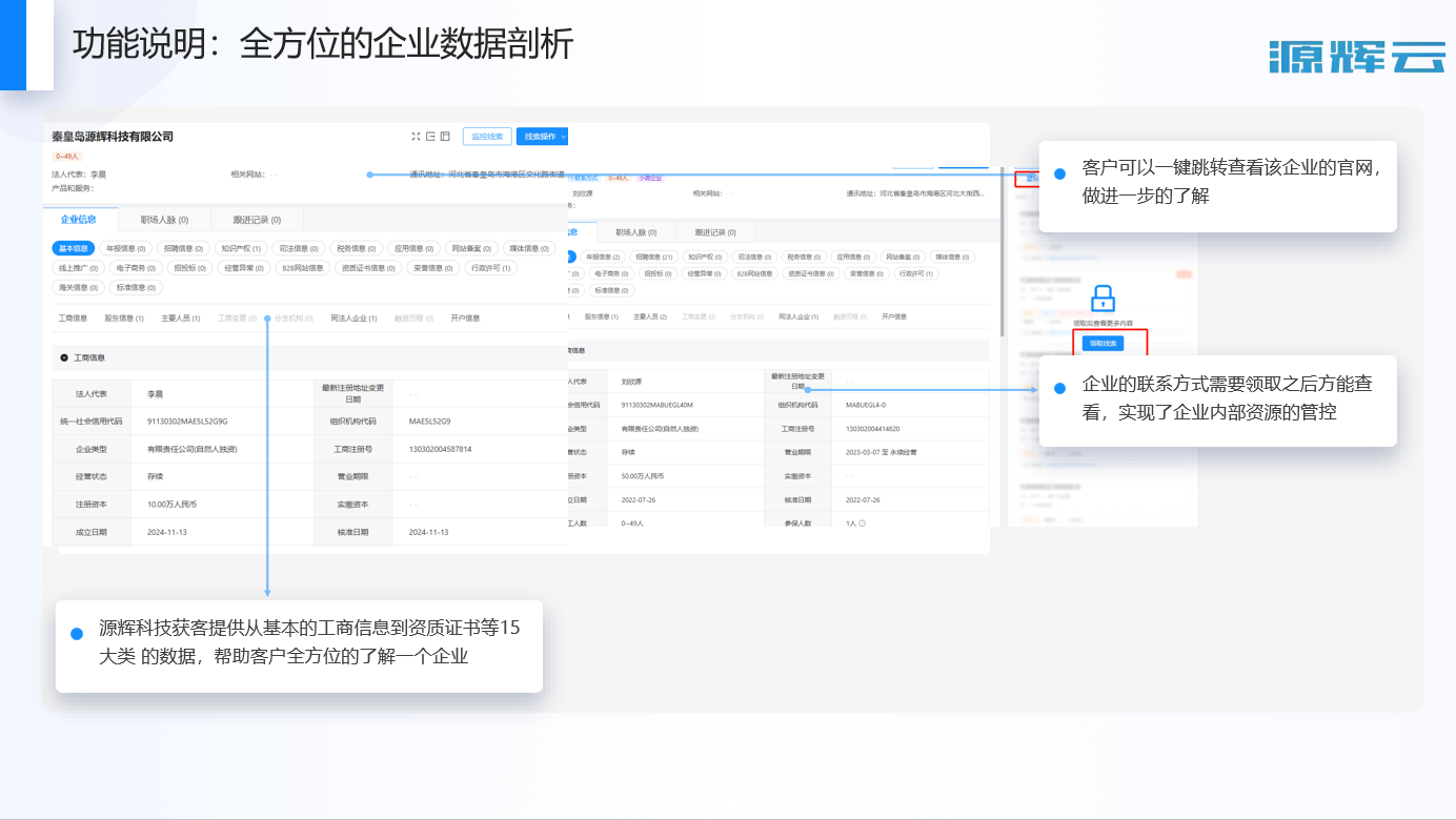 通过对全网企业信息的挖掘和分析,基于目标用户的 实际需求,建立销售模型,帮助销售挖掘意向客户、 提升成单效率。